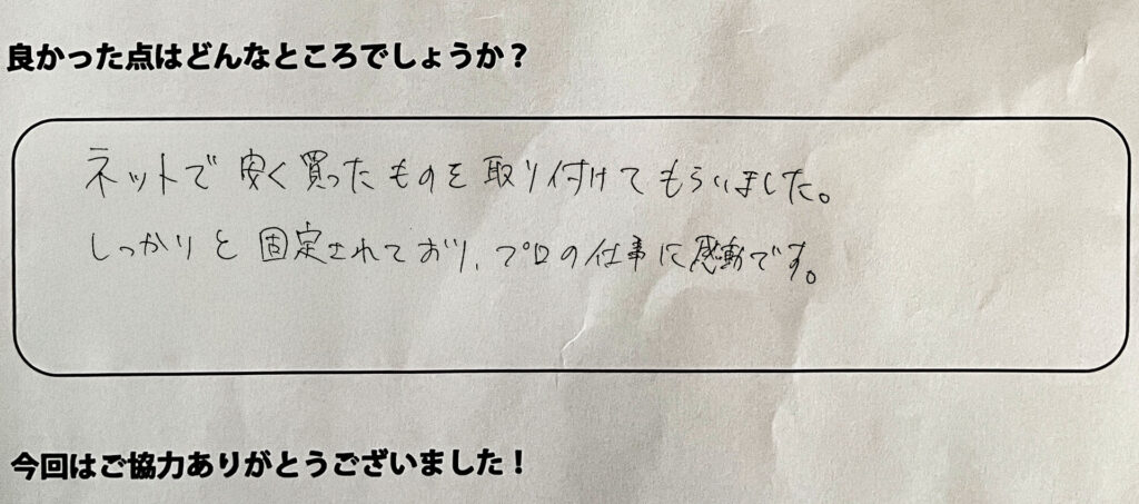 ネットで安く買ったものを取り付けてもらいました。しっかりと固定されており、プロの仕事に感動です。