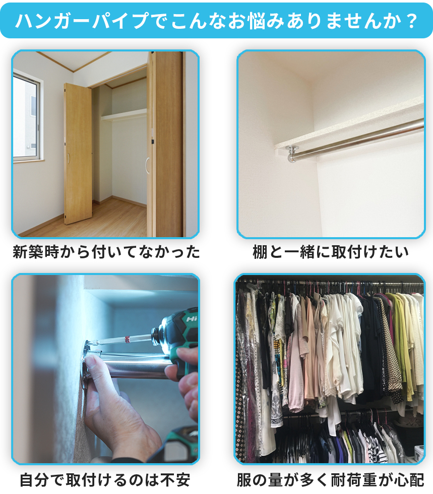 ハンガーパイプは適切な位置にしっかり取り付ければ、収納力が増し、使い勝手も大きく向上します。ところが自分で取り付けようとすると、水平がずれたり壁に固定できなかったりと、思っていた以上に難しい作業というのが分かります。場合によっては衣類の落下や壁の破損につながることもあります。