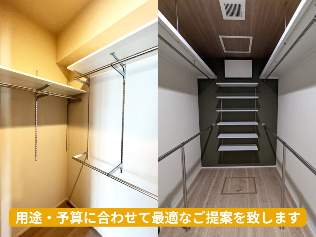 1本のみのシンプルな設置はもちろん、可動棚と組み合わせた収納工事や、ウォークインクローゼットの容量を2倍にする施工などどんな工事も対応可能です!日常の使いやすさを考えたプロの施工なら、収納力も満足度も格段にアップします。