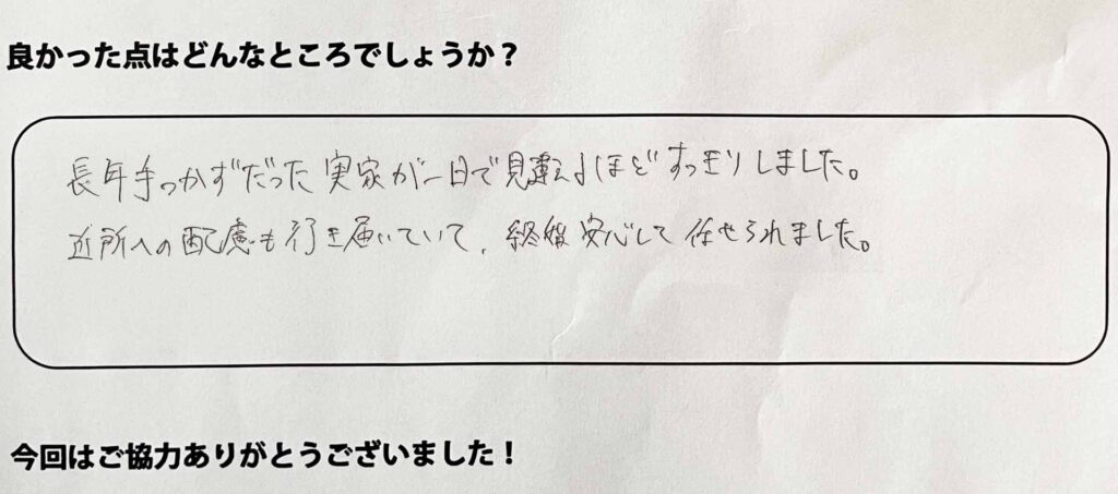 長年手つかずだった実家が一日で見違えるほどすっきりしました。近所への配慮も行き届いていて、終始安心して任せられました