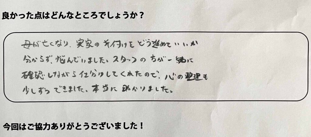 母が亡くなり、実家の片付けをどう進めていいか分からず悩んでいました。スタッフの方が一緒に確認しながら仕分けしてくれたので、心の整理も少しずつできました。本当に助かりました。