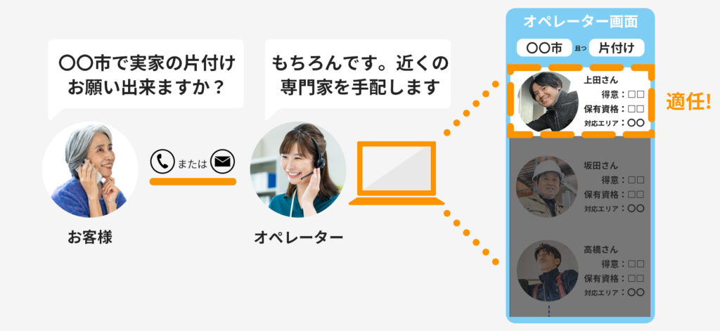 当社は「電話がすぐにオペレーターに繋がる」を意識しております。昨今のAIでの対応や、メールのみでしかやり取り出来ないシステムはお客様の貴重なお時間を取っていると当社は考えております。そのため「現場のことがわかるオペレーターにすぐにつながり、相談や手配の依頼が出来る」を意識した体制設計に力を入れております。
