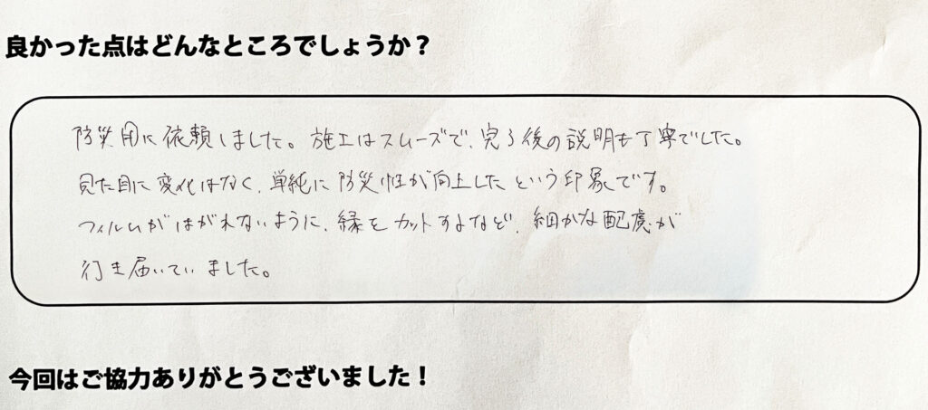 防災用に依頼しました。施工はスムーズで完了後の説明も丁寧でした。見た目に変化はなく、単純に防災性が向上したという印象です。フィルムが剥がれないように縁をカットするなど細かな配慮が行き届いてました。