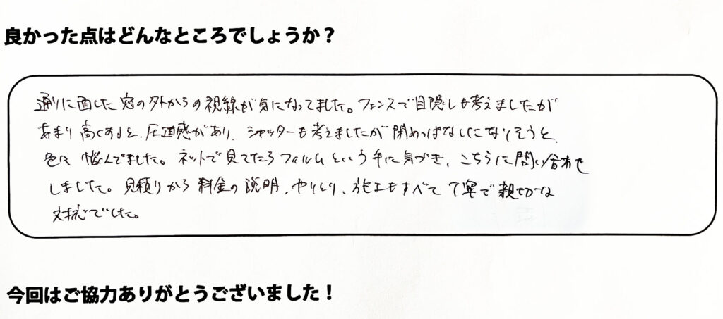 通りに面した窓の外からの視線が気になってました。フェンスで目隠しも考えましたがあまり高くすると圧迫感があり、シャッターも考えましたが閉めっぱなしになりそうと色々悩んでいました。ネットで見ていたらフィルムという手に気づき、こちらに問い合わせしました。見積から料金の説明、やりとり、施工も全て丁寧で親切な対応でした。